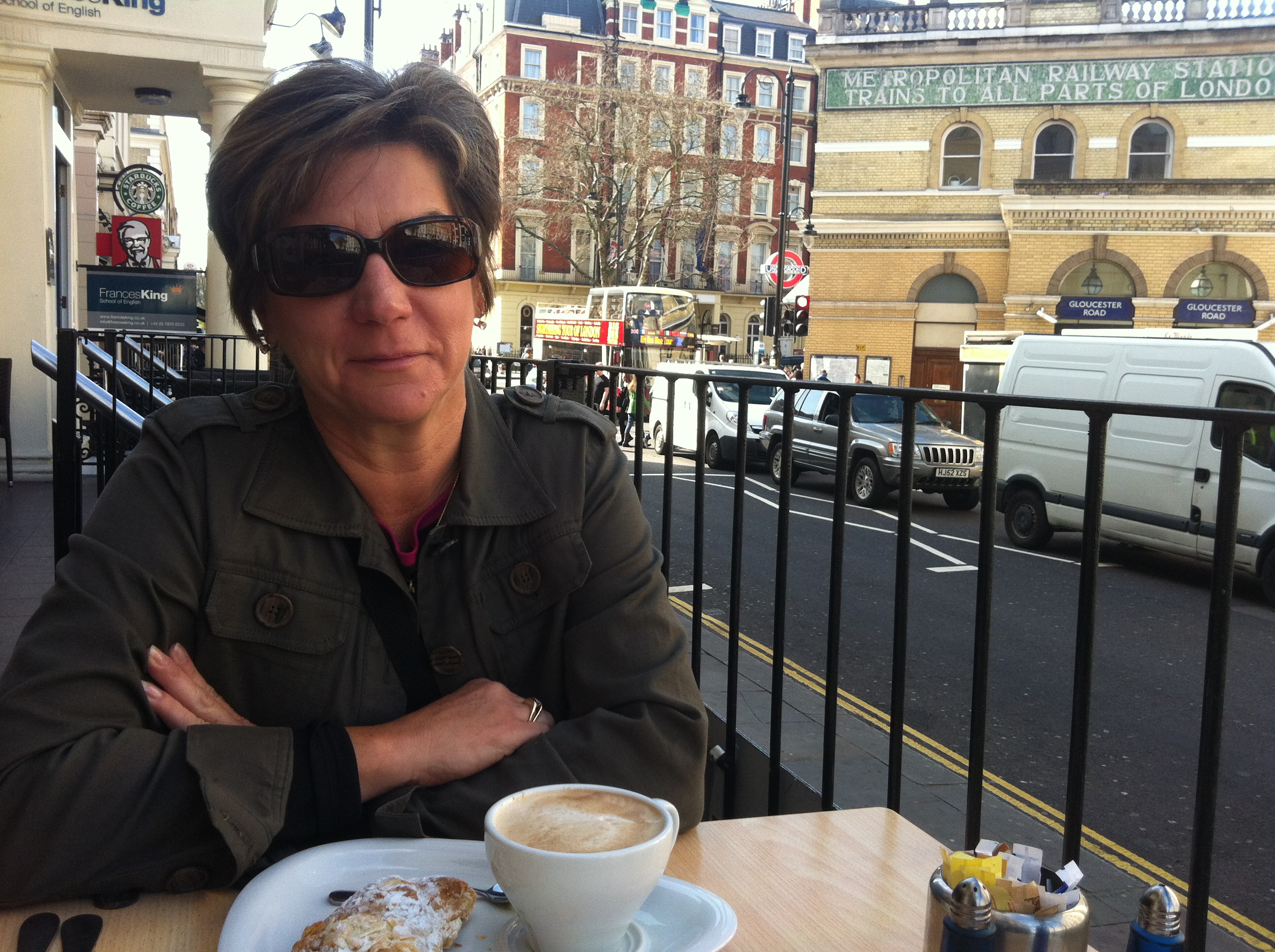 This morning before the shuttle showed up to take the flight crew back to Heathrow, Aunt Janie and I stopped for croissants and coffee for breakfast and then went out in search of the Mews!